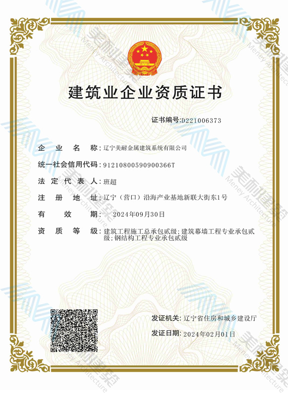 遼寧美耐金屬建筑系統(tǒng)有限公司位于遼寧(營(yíng)口)沿海產(chǎn)業(yè)基地,專(zhuān)注于預(yù)制金屬建筑系統(tǒng)領(lǐng)域,是一家集工業(yè)建筑設(shè)計(jì)、制作、施工及相關(guān)的技術(shù)咨詢與服務(wù)為一體的綜合性服務(wù)企業(yè)。作為國(guó)家鋼結(jié)構(gòu)協(xié)會(huì)會(huì)員、中國(guó)建筑金屬結(jié)構(gòu)協(xié)會(huì)會(huì)員單位與國(guó)家高新技術(shù)企業(yè),美耐建筑集建筑工程施工總承包、鋼結(jié)構(gòu)工程專(zhuān)業(yè)承包等多種資質(zhì)于一身,并擁有22項(xiàng)鋼結(jié)構(gòu)建筑領(lǐng)域?qū)@?項(xiàng)軟件著作權(quán)。